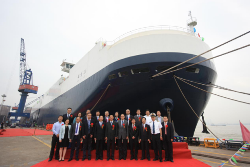 On April 25, with spring in the air, colored banners spread in the wind and the beating of gongs and drums resounded beside the Yangtze River. The grand ceremony of delivery of car transport vessel1# of PCTC series with 3800 parking spots invested and manufactured by Anji Shipping Co., Ltd. under Anji Logistics and the entry of vessel 2#to berth was held in Jinling Factory District of Jiangsu. Leaders and guests from Anji Logistics, Anji Shipping, Changhang Heavy Industry, Jinling Shipyard, CCS, and CSSC together witnessed this great moment.