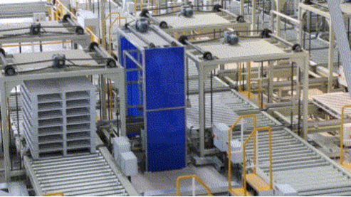 The whole pallet of material is moved to warehousing transport line to flow to the altitude storage rack when material needs warehousing.