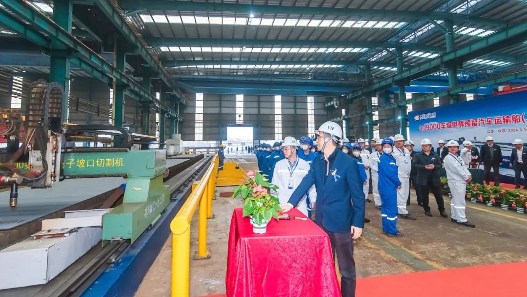 3月14日,上汽申博sunbet建造的首艘9000车级甲醇预留汽车运输船首制船(JLZ8230405),在招商局工业集团旗下金陵船舶(南京)有限公司正式开工点火,全面进入开工建造阶段,预计2025年6月上旬交付。