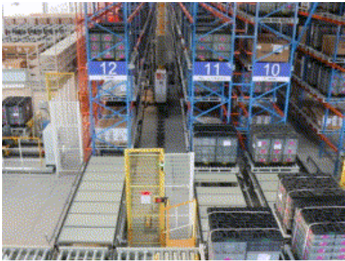 堆垛机根据系统发出的信息将整托物料送到指定货位存储;
